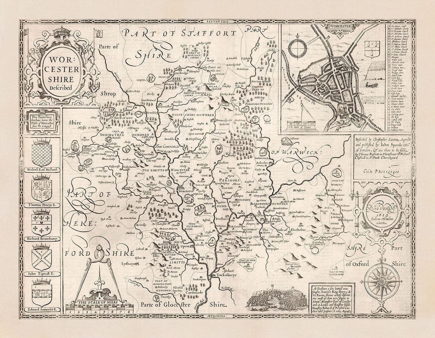 Alte monochrome Karte von Worcestershire, 1611 von John Speed: Worcester, Bromsgrove, Kidderminster, Malvern, Droitwich