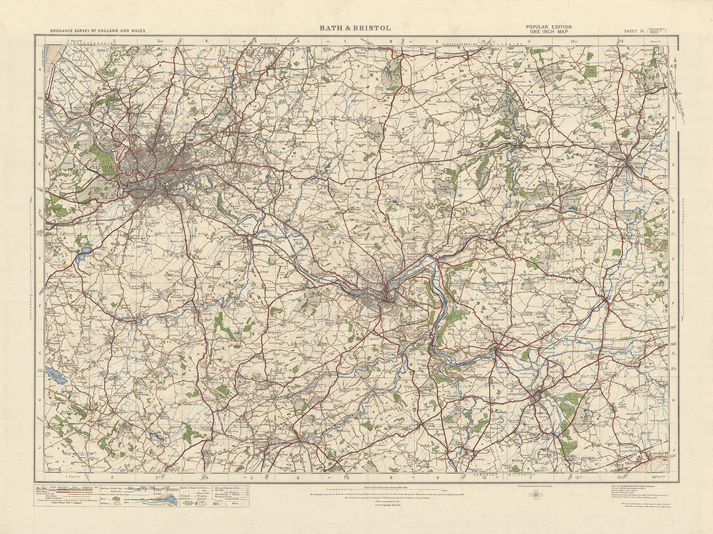 Erleben Sie den Reiz der Vergangenheit mit dieser sorgfältig detaillierten alten Ordnance Survey-Karte, Blatt 111 – Bath und Bristol, 1925. Entdecken Sie den historischen Charme von Bath und Bristol, erkunden Sie die umliegenden Städte und tauchen Sie ein in die natürliche Schönheit der Cotswolds AONB.