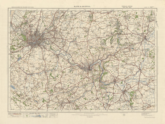 Diese alte Ordnance Survey-Karte, Blatt 111 – Bath & Bristol, wurde 1925 als Teil der One-Zoll-„Popular“-Ausgabe für England und Wales veröffentlicht. Die Karte zeigt die historische Grafschaft Somerset, in der sich die bedeutenden Städte Bath und Bristol befinden. Zusätzlich zu diesen prominenten Städten umfasst die Karte auch die Städte Chippenham, Trowbridge, Corsham, Melksham und das malerische Cotswolds Area of Outstanding Natural Beauty (AONB).