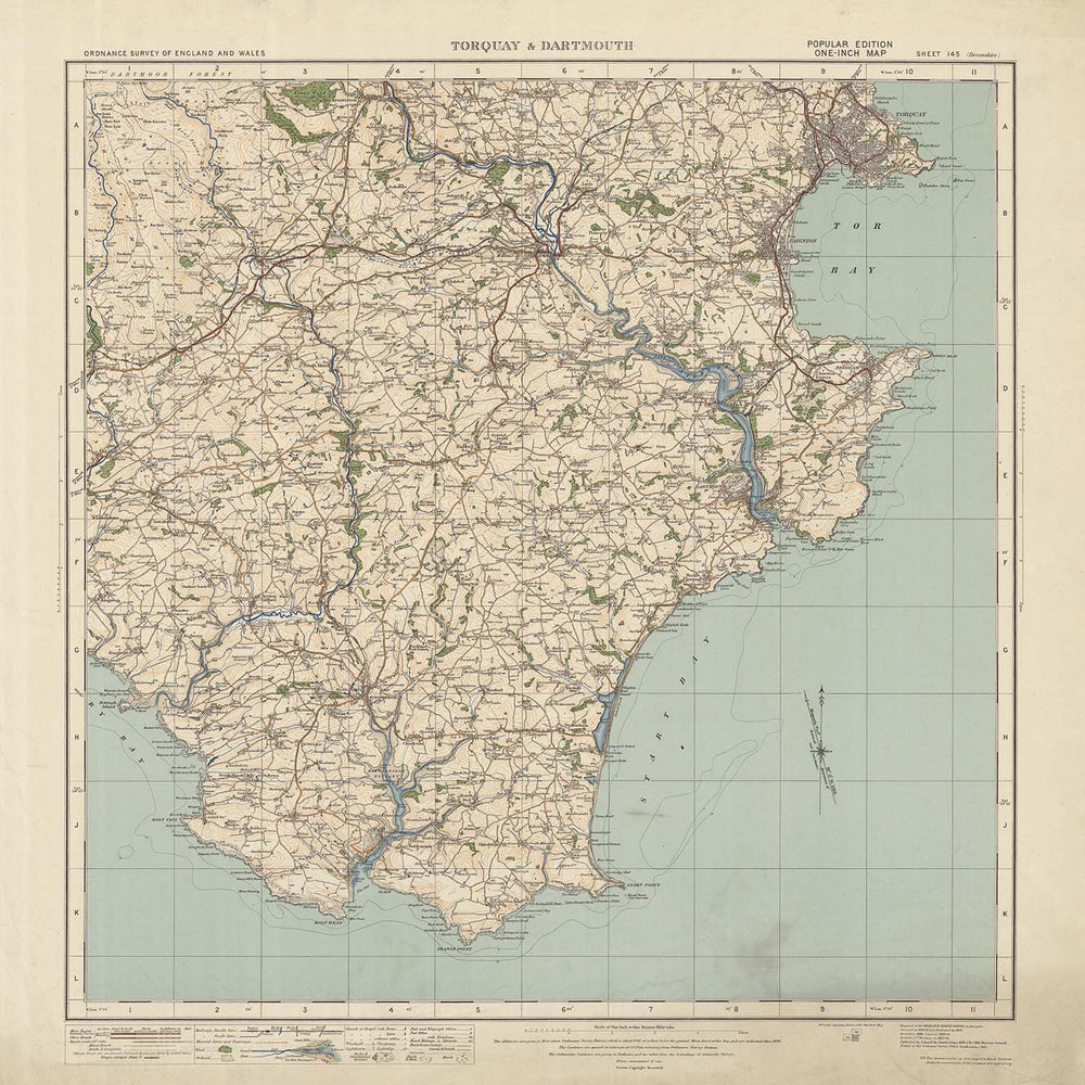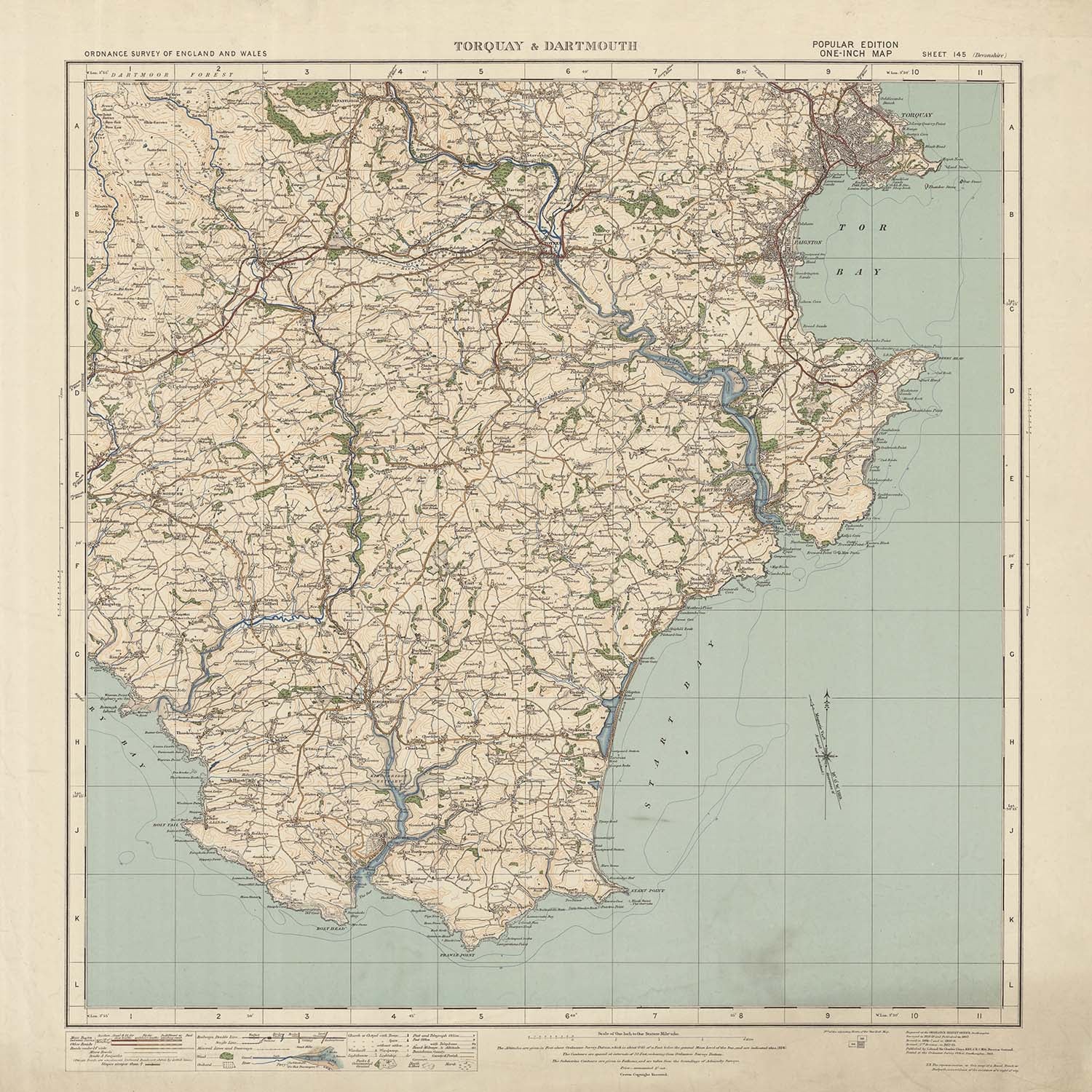 Tauchen Sie mit der Karte "Blatt 145 - Torquay & Dartmouth" in die faszinierende Geschichte und Topographie des Südwestens Englands zu Beginn des 20. Bei diesem Produkt handelt es sich um eine authentische Reproduktion der One-inch "Popular"-Ausgabe, die ursprünglich zwischen 1919 und 1926 vom Ordnance Survey veröffentlicht wurde. Die Karte zeigt eine detaillierte geografische Ausdehnung, wobei jede Seite 21 Meilen misst und die Hypotenuse sich über 30 Meilen erstreckt, mit Blackawton in Devon als Mittelpunkt. Dieser Landstrich umfasst eine reiche Palette von Landschaften in Devonshire und an der Küste.
