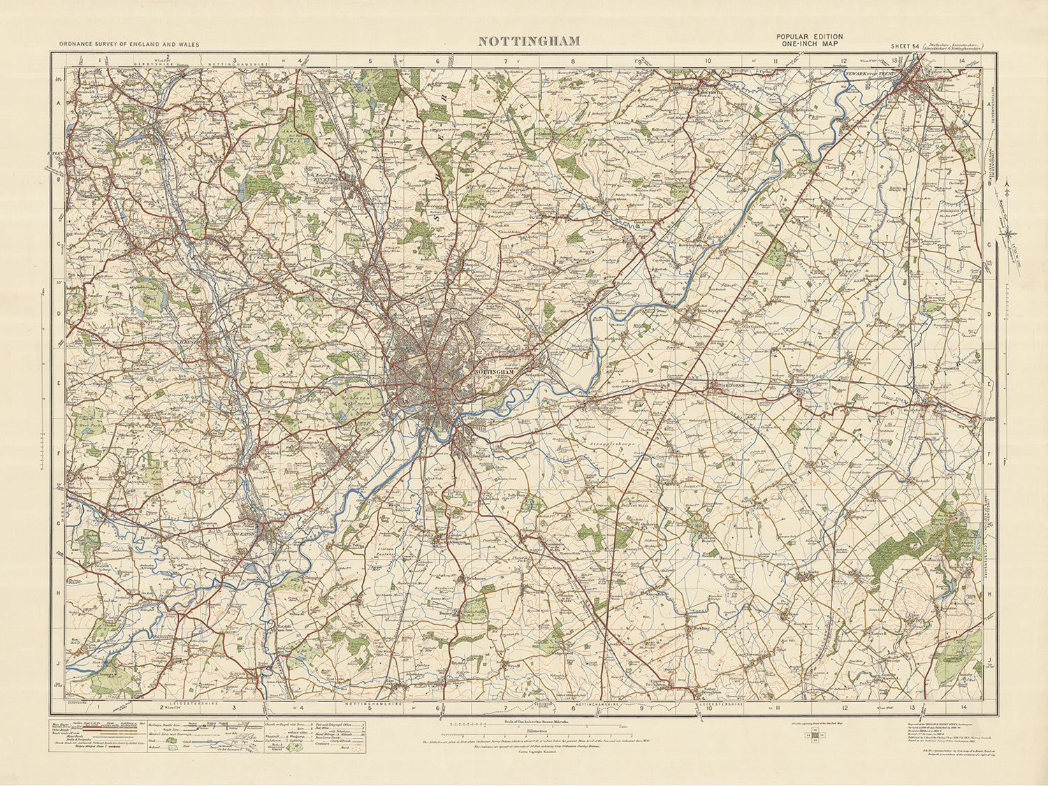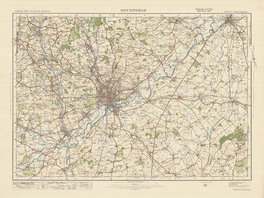 Die „Old Ordnance Survey Map, Blatt 54 – Nottingham, 1925“ ist ein faszinierendes Stück kartografischer Geschichte, das eine detaillierte Momentaufnahme von Nottingham und seinen umliegenden Gebieten im frühen 20. Jahrhundert bietet. Diese Karte, Teil der One-Zoll-Ausgabe „Popular“ für England und Wales, bietet eine Fülle von Informationen über die Städte und interessanten Sehenswürdigkeiten, die es damals gab.