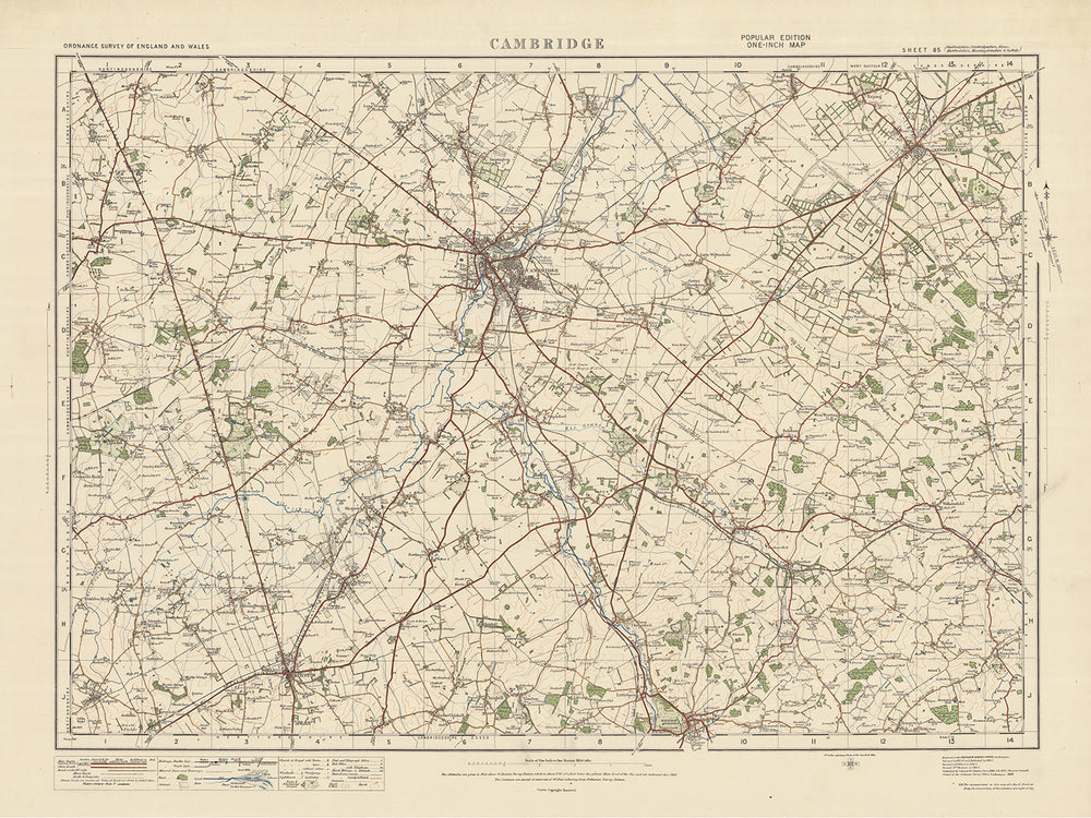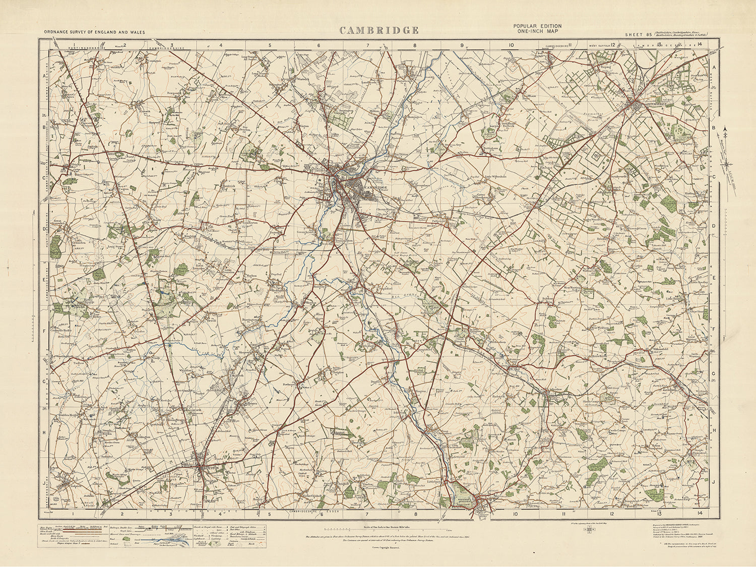 Die Old Ordnance Survey Map, Blatt 85 – Cambridge, 1925 ist ein faszinierendes Stück kartografischer Geschichte, das einen Einblick in die Vergangenheit bietet. Diese Karte, Teil der One-Zoll-Ausgabe „Popular“ für England und Wales, bietet eine detaillierte Darstellung der Region Cambridge im frühen 20. Jahrhundert. Diese Karte mit der historischen Grafschaft Cambridgeshire zeigt nicht nur die Stadt Cambridge, sondern auch mehrere andere bemerkenswerte Städte und Gebiete.