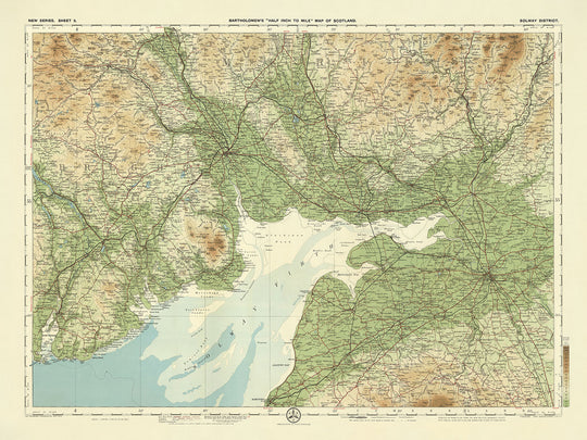 Die Karte deckt Teile von Südschottland und Nordengland ab und hebt bedeutende geografische Merkmale wie den Solway Firth, den Fluss Nith, den Fluss Annan und den Fluss Esk hervor. Die majestätischen Hügel und Berge, einschließlich Criffel, Skiddaw und Helvellyn, sind prominent dargestellt und bieten einen Einblick in die natürliche Schönheit der Region. Die Karte zeigt auch wichtige Verkehrswege, mit zahlreichen Eisenbahnlinien und Hauptstraßen, die sich durch die Landschaft ziehen und die Konnektivität und Erreichbarkeit der Gegend zu dieser Zeit veranschaulichen.