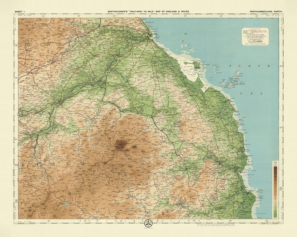 Blatt 1 - Northumberland - Nord, erstellt von dem angesehenen Kartografen J.G. Bartholomew im Jahr 1901, ist ein Zeugnis der Kunst und Wissenschaft der Kartografie des frühen 20. Jahrhunderts. Diese Karte im Maßstab von einer halben Zoll pro Meile, Teil von Bartholomews Flaggschiff-Serie, wurde sorgfältig entworfen, um dem wachsenden Interesse am Radfahren und Tourismus gerecht zu werden. Die Klarheit und ästhetische Anziehungskraft der Karte werden durch ihren innovativen Einsatz von Farbverläufen zur Darstellung des Landschaftsreliefs verstärkt, was eine visuell ansprechende und informative Darstellung der vielfältigen Landschaft Northumberlands bietet.