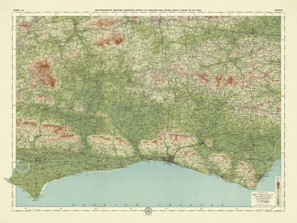 Das Design dieser Karte ist besonders bemerkenswert für die innovative Verwendung von Farben zur Darstellung des Landschaftsreliefs. Verschiedene Schichten von Farbbändern verlaufen subtil, um Land in unterschiedlichen Höhen zu zeigen, und bieten eine lebendige und informative Darstellung des Geländes. Die South Downs, mit ihren sanften Kreidehügeln, sind prominent dargestellt, zusammen mit anderen natürlichen Wahrzeichen wie den ikonischen Kreidefelsen von Beachy Head und der üppigen Ausdehnung des Ashdown Forest. Die ästhetische Anziehungskraft der Karte wird durch ihr funktionales Design ergänzt, was sie zu einem geschätzten Besitz sowohl für Sammler als auch für Geschichtsinteressierte macht.