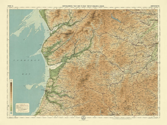 Das Design der Karte ist sowohl funktional als auch künstlerisch, mit einer Landschaftsorientierung, die ihre Lesbarkeit und visuelle Wirkung verbessert. Der subtile Farbverlauf der Farbbänder, um Land in unterschiedlichen Höhen darzustellen, ist ein Zeugnis für Bartholomews Geschick und seine Liebe zum Detail. Diese Technik ermöglicht ein nuanciertes Verständnis des Geländes und hebt Merkmale wie den Plynlimon, den höchsten Punkt der Cambrian Mountains, und die üppigen Täler hervor, die von den Flüssen der Region geformt wurden. Die Karte markiert auch bedeutende historische Wahrzeichen, einschließlich der Ruinen der Strata Florida Abbey und der ikonischen Teufelsbrücke, und fügt den geografischen Informationen kulturelle und historische Kontexte hinzu.