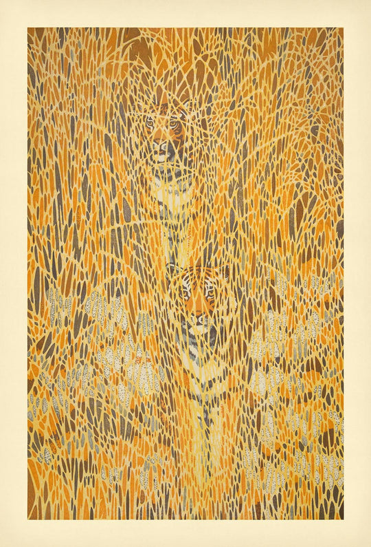 Die von Yoshida in diesem Stück verwendete Farbpalette ist harmonisch und erdig, dominiert von warmen goldenen Ockertönen, üppigen Waldgrüntönen und sanften Brauntönen. Diese Farben veranschaulichen wunderbar die natürliche Tarnung der Tiger und verstärken die ruhige und eindringliche Qualität des Kunstwerks. Yoshidas durchdachtes Schichten von Farben und präzise Schnitztechniken erzeugen ein Gefühl von stiller Bewegung und Subtilität, das die Vorstellungskraft des Betrachters fesselt.