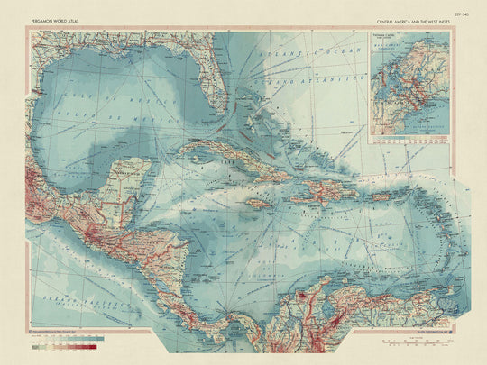 Ein faszinierender Aspekt dieser Karte ist die detaillierte Darstellung des Panamakanals, eines Wunderwerks der Ingenieurskunst, das den globalen Handel und die Schifffahrt maßgeblich beeinflusst hat. Der Kanal, der den Atlantik und den Pazifischen Ozean verbindet, ist so präzise dargestellt, dass er einen fesselnden Einblick in seine komplexe Struktur und Funktionsweise bietet. Die Darstellung dieser wichtigen Wasserstraße auf der Karte spiegelt ihre historische Bedeutung und den tiefgreifenden Einfluss wider, den sie auf die Wirtschaft und Geopolitik der damaligen Zeit hatte.