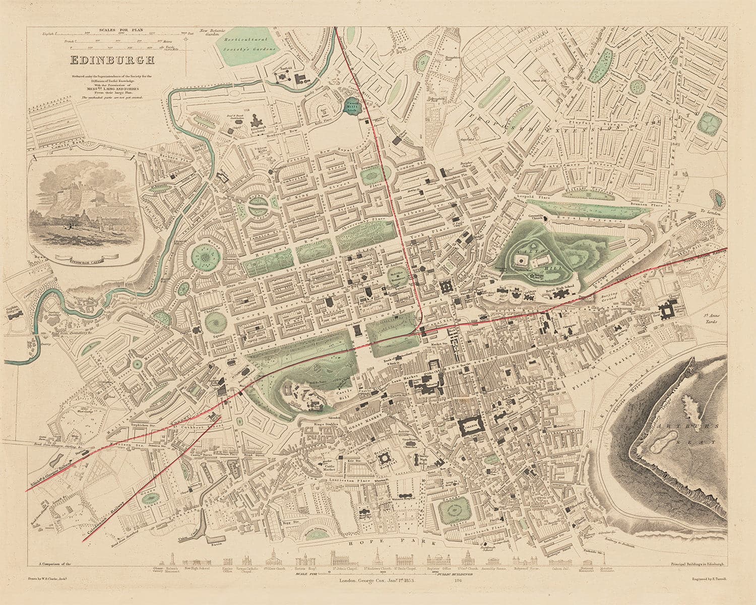 Der Water of Leith ist in einem schönen Blau gefärbt und schlängelt sich über die linke Seite der Karte. Eine hochdetaillierte Gravur von Edinburgh Castle ist links eingefügt.