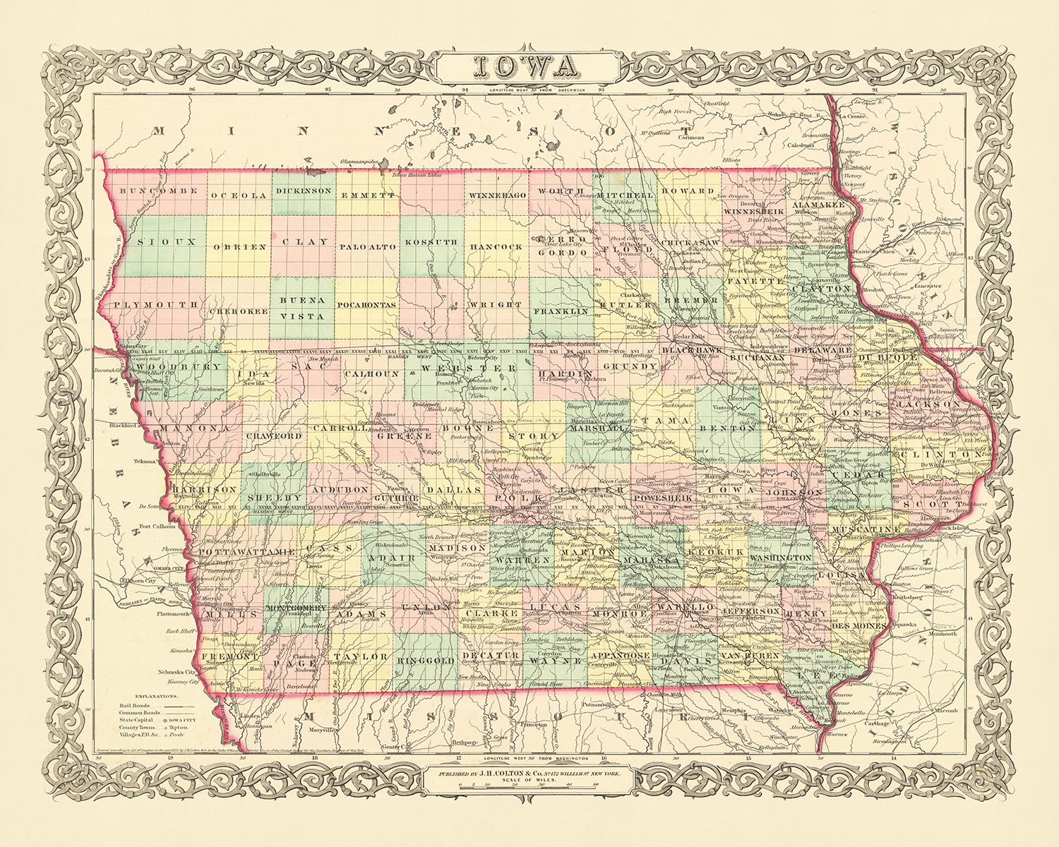 Diese alte Karte von Iowa von JH Colton ist mehr als nur ein historisches Artefakt. Es ist ein Kunstwerk, ein Fenster in die Vergangenheit und ein Beweis für das Können und die Hingabe eines der besten Kartographen Amerikas. Egal, ob Sie ein Geschichtsinteressierter, ein Sammler oder einfach jemand sind, der feine Handwerkskunst zu schätzen weiß, diese Karte wird mit Sicherheit eine wertvolle Ergänzung Ihrer Sammlung sein.