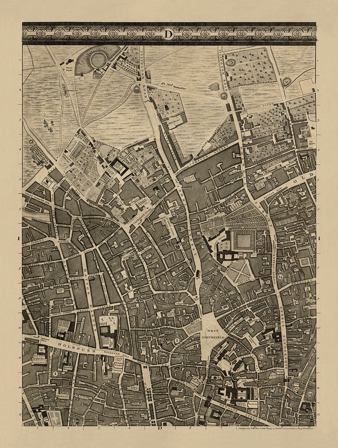 Alte Karte von London, 1746 von John Rocque, D1: Holborn, Clerkenwell, Farringdon, Barbican, Westminster, City of London, Smithfield Markt