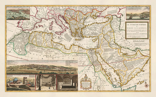 Diese Karte enthält auch einige wunderschön detaillierte Inset-Gravuren von Konstantinopel (Istanbul) und Jerusalem - damals und heute zwei der wichtigsten Städte der Region.