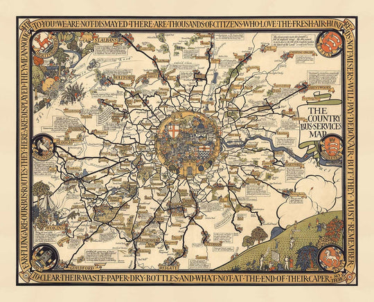 Diese wunderschöne und absolut einzigartige Karte von London aus dem Jahr 1928, erstellt von dem Meister der bildlichen Kartografie Macdonald (Max) Gill, zeigt, wie "weitläufig unsere Buslinien sind" von London zu den umliegenden Grafschaften - Kent, Surrey, Buckinghamshire, Hertfordshire, Essex und Middlesex.