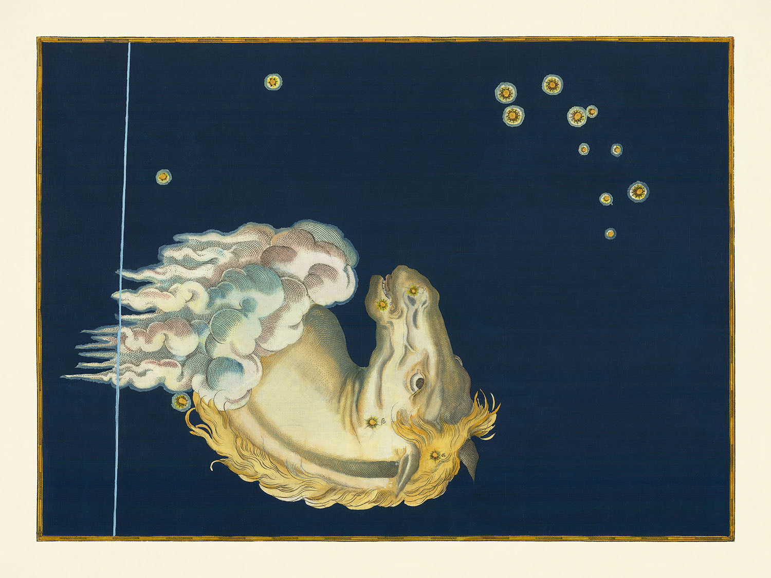 "Alte Sternkarte von Equuleus" ist eine elegant handkolorierte Sternenkarte von Johann Bayer, die erstmals 1603 veröffentlicht wurde. Dieses beeindruckende Stück zeigt das Sternbild Equuleus, bekannt als das "Kleine Pferd" auf Griechisch. Equuleus war eines der 48 Sternbilder, die vom renommierten Astronomen Ptolemäus im 2. Jahrhundert katalogisiert wurden und wird auch heute noch unter den 88 modernen Sternbildern anerkannt, wie sie von der Internationalen Astronomischen Union definiert sind.