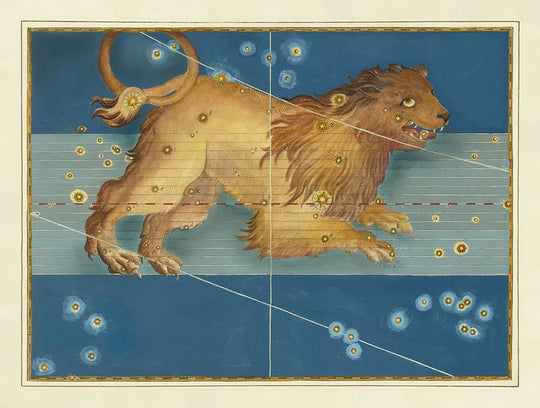Diese Sternenkarte wurde ursprünglich 1603 in Johann Bayers "Uranometria" veröffentlicht, vielleicht dem einflussreichsten Sternenatlas, der jemals veröffentlicht wurde und dem Vorläufer aller modernen Sternenatlanten. Sie enthielt 51 hochgenaue Sternkarten, von denen 48 die ptolemäischen Sternbilder waren. Und natürlich waren auch die 12 Hauptzeichen des Tierkreises, einschließlich dieses schönen Löwen, enthalten.