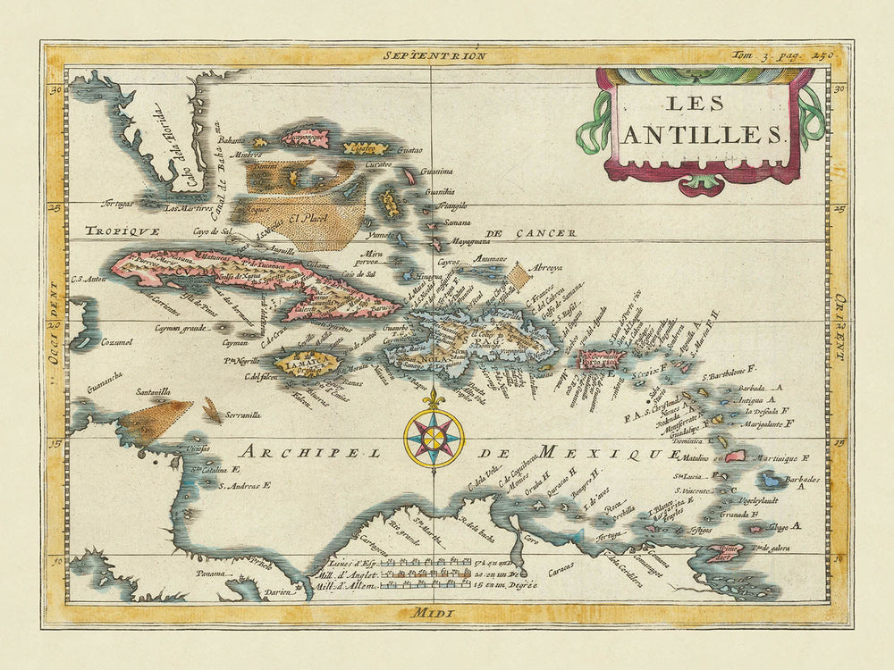 Die detaillierte Geografie der Karte ist ein Zeugnis für Du Plessis’ Können. Von der weitläufigen Fläche Kubas und dem bergigen Rückgrat Hispaniolas bis hin zur komplizierten Kette der Kleinen Antillen wird jede Insel mit sorgfältiger Aufmerksamkeit für Küstenlinie, Topografie und natürliche Merkmale dargestellt. Das „Mer des Antilles“ (Karibisches Meer) ist fett gedruckt beschriftet und verankert die Inseln innerhalb der breiteren atlantischen Welt, während Gebirgszüge und raue Innere auf die beeindruckenden Landschaften hinweisen, die frühe Entdecker und Siedler erwarteten.