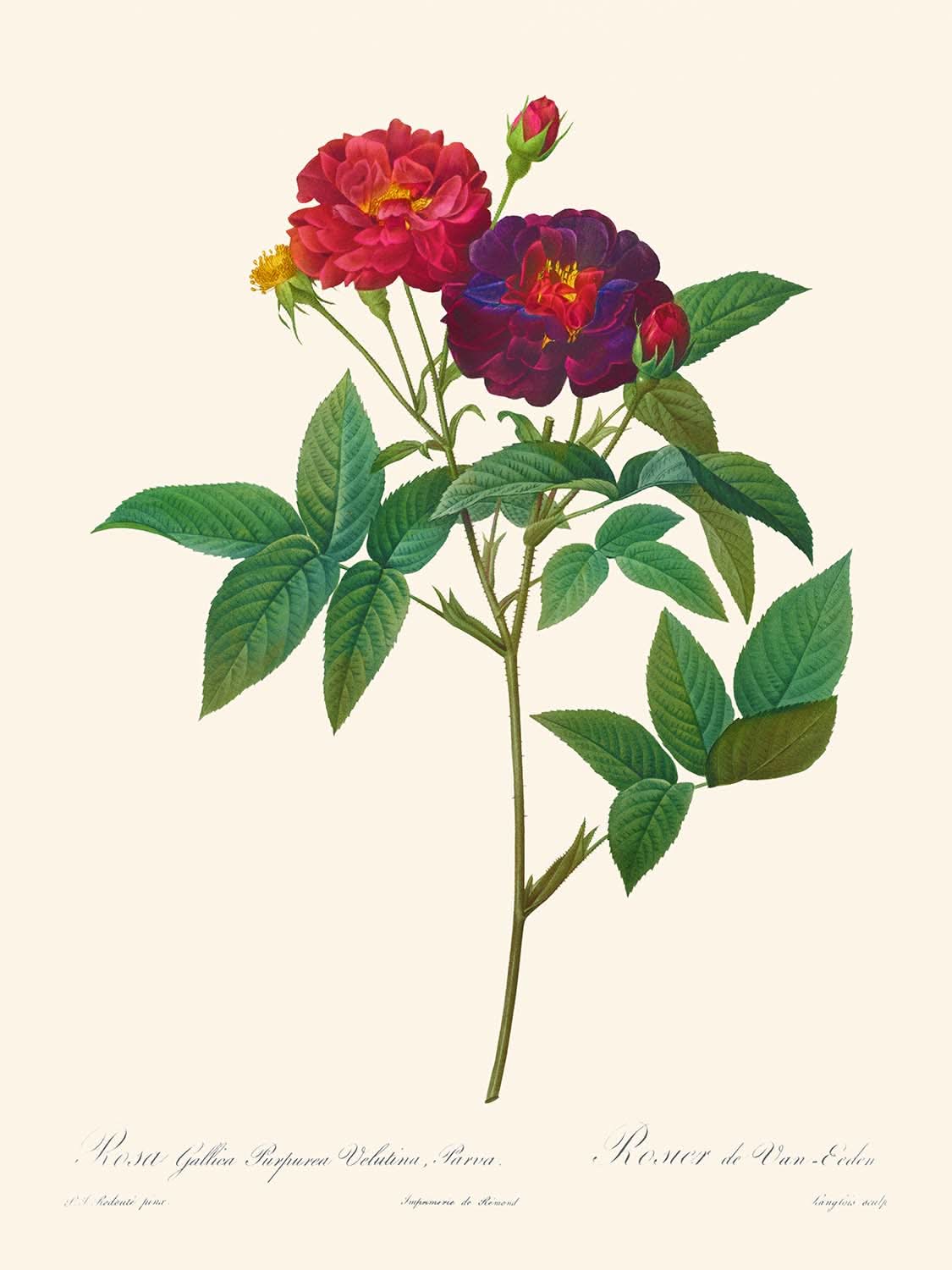 Erleben Sie die Schönheit und Handwerkskunst von Pierre-Joseph Redouté mit einem hochwertigen Kunstdruck der Rosa Gallica Purpurea Velutina Parva, der exklusiv bei The Unique Maps Co. erhältlich ist. Jeder Druck wird sorgfältig von Hand gefertigt, um sicherzustellen, dass die Details auf hochwertigem Archiv-Mattpapier erhalten und hervorgehoben werden, ein Beweis für die Haltbarkeit, die sicherstellt, dass das Kunstwerk jahrzehntelang lebendig bleibt. Durch personalisierte Optionen kann Ihr Stück Ihren individuellen Geschmack und Ihre Wünsche widerspiegeln.