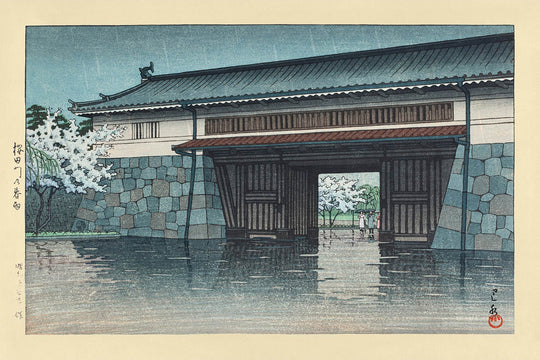 Tauchen Sie ein in den ruhigen Reiz von "Frühling Regen am Sakurada Tor, Tokio" des gefeierten japanischen Künstlers Hasui Kawase. Ursprünglich 1935 geschaffen und im Japanischen als "Sakuradamon no Harusame" (桜田門の春雨) betitelt, lädt dieser ikonische Holzschnitt den Betrachter in die stille Poesie eines regnerischen Frühlingstags in Tokio ein. Kawase, der weithin als Meister der shin-hanga (“neue Drucke”) Bewegung angesehen wird, ist bekannt für seine eindrucksvollen Landschaften, die traditionelle ukiyo-e Techniken mit impressionistischen Einflüssen wunderschön verbinden, um die Stimmung und Atmosphäre des frühen zwanzigsten Jahrhunderts in Japan einzufangen.