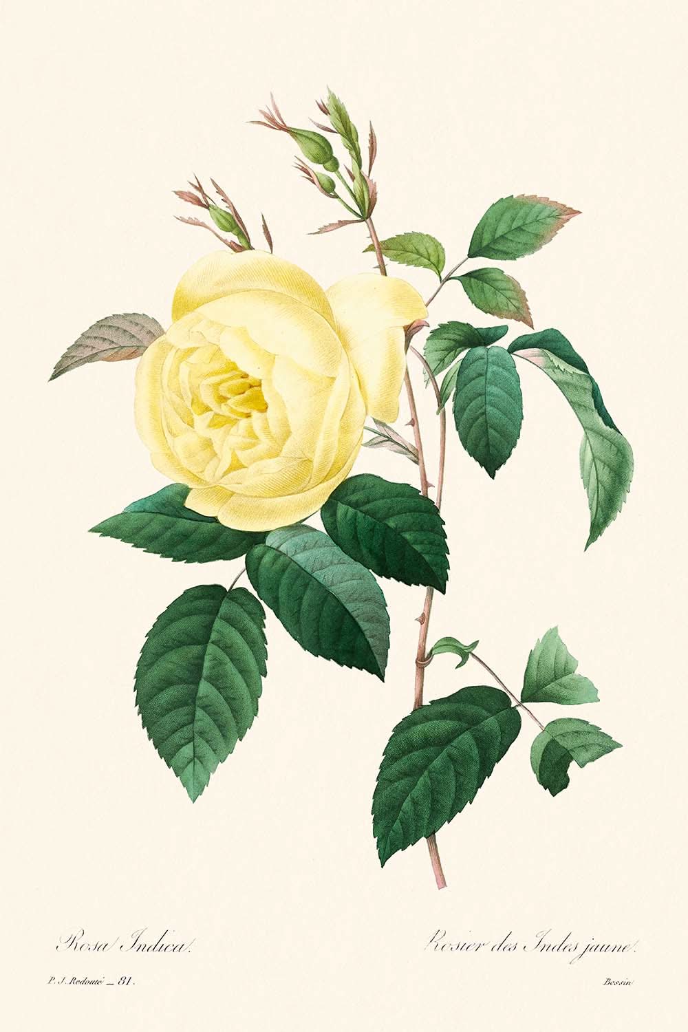 Yellow Rose, erstmals 1802 enthüllt, ist ein atemberaubendes Beispiel viktorianischer botanischer Illustration des berühmten Künstlers Pierre-Joseph Redouté. Redouté, einer der am meisten verehrten botanischen Illustratoren der Geschichte, widmete einen Großteil seiner Karriere der Darstellung der Schönheit der Blumen im Château de Malmaison unter der Schirmherrschaft von Josephine Bonaparte, der Frau Napoleons. Der gebürtige Belgier erlangte als Mallehrer für Marie Antoinette Bekanntheit und sein umfangreiches Werk umfasst über 2.100 botanische Gemälde mit mehr als 1.800 Arten.