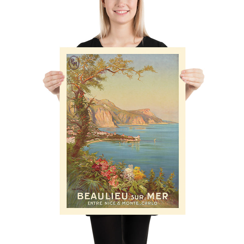 P. L. M. Beaulieu sur mer by Pierre Comba captures the sunlit enchantment of the French Riviera at the dawn of modern tourism. Created in 1920 for the famed P.L.M. railway, the poster invites travelers to Beaulieu-sur-Mer, a jewel nestled between Nice and Monaco. Comba channels the lingering spirit of the Belle Époque—romance, ease, and seaside glamour—into a view where sweeping coastline, floral foregrounds, and distant, rugged mountains converge in a scene of unhurried leisure. Lithographic color and crisp, elegant lettering transform the landscape into an irresistible promise of Mediterranean escape.