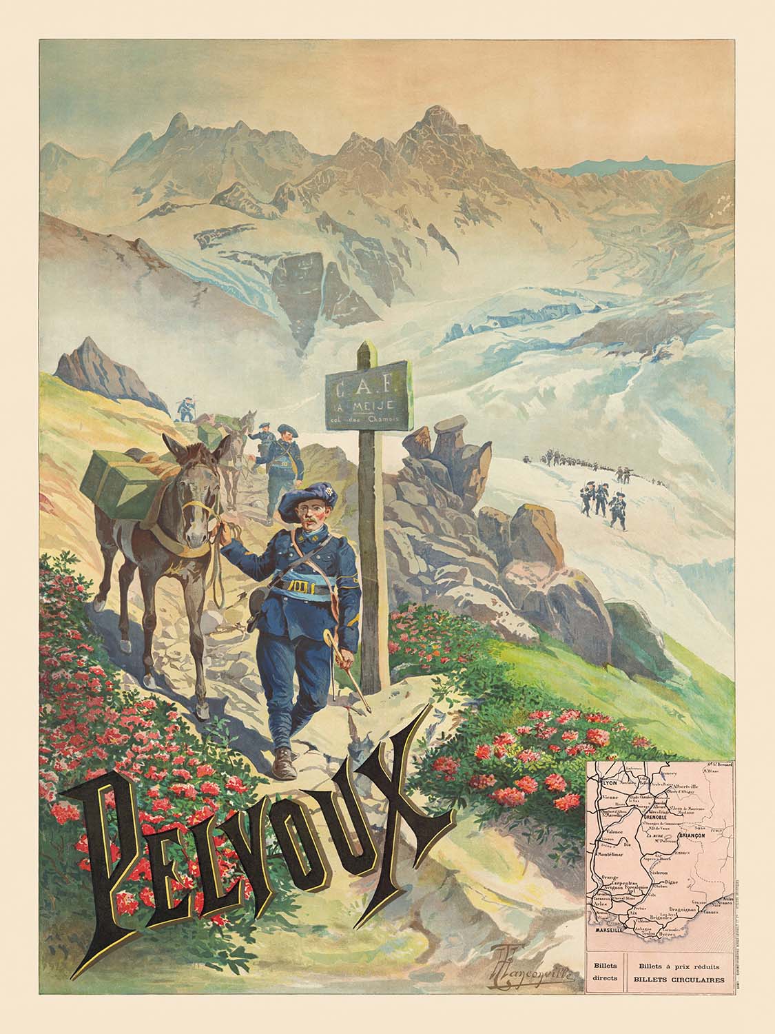 The subject here is the Pelvoux massif in southeastern France, a magnet for mountaineers and nature-seekers in the age when rail made the Alps newly accessible. PLM’s travel posters were cultural touchstones, transforming distant peaks into attainable escapes. In 1895, destinations like Pelvoux embodied the modern ideal of outdoor leisure—crisp mountain light, clean air, and the thrill of paths leading to the unknown.