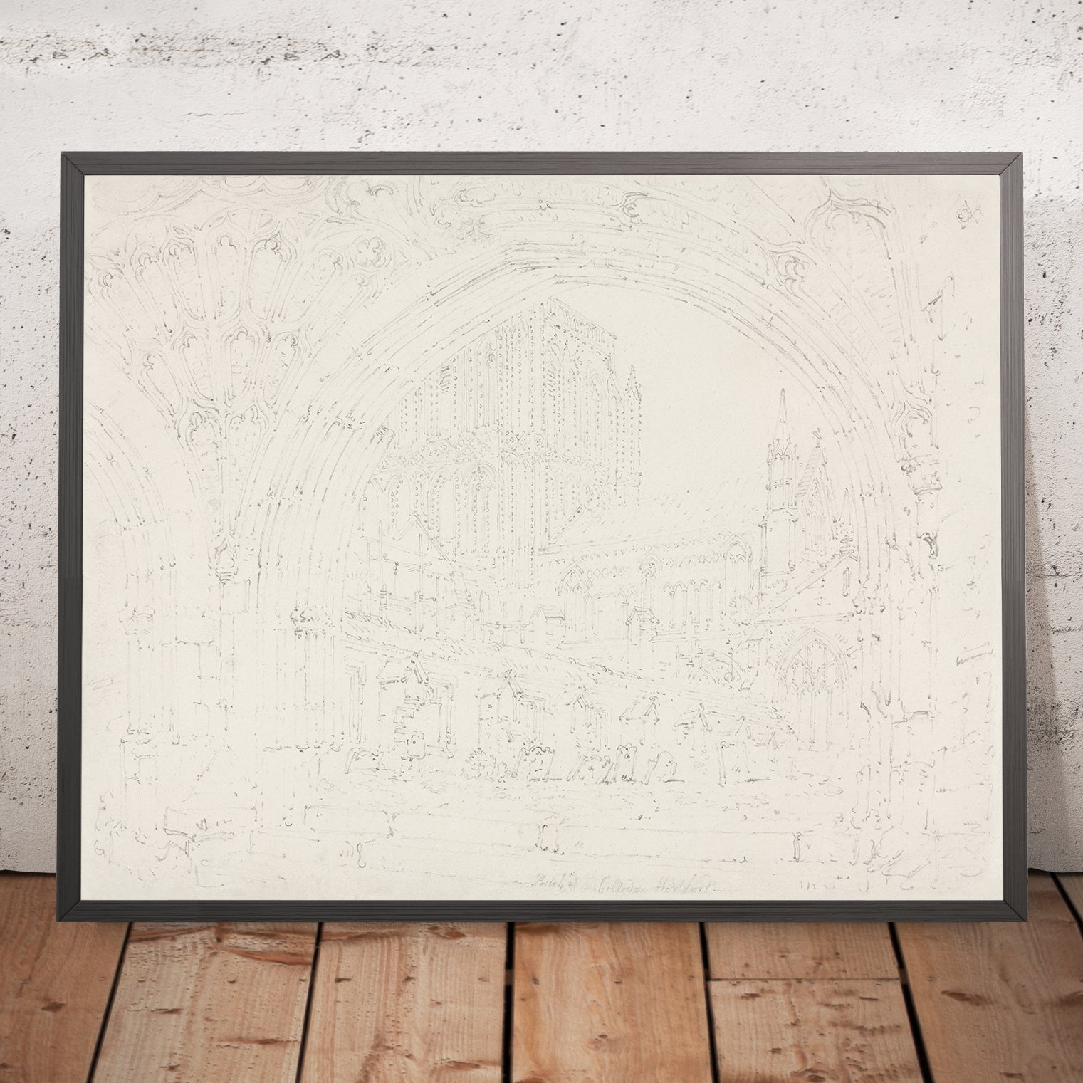 Hereford Cathedral (1793) by Joseph Mallord William Turner introduces us to the young master at a pivotal early moment in his career. Turner, later celebrated as the great poet of light in British Romanticism, was then honing his eye through close studies of historic architecture. In this monochromatic painting, he lingers on the Gothic drama of Hereford Cathedral—its pointed arches, ribbed vaults, and sculpted stone—invoking a contemplative hush that feels both scholarly and profoundly atmospheric.