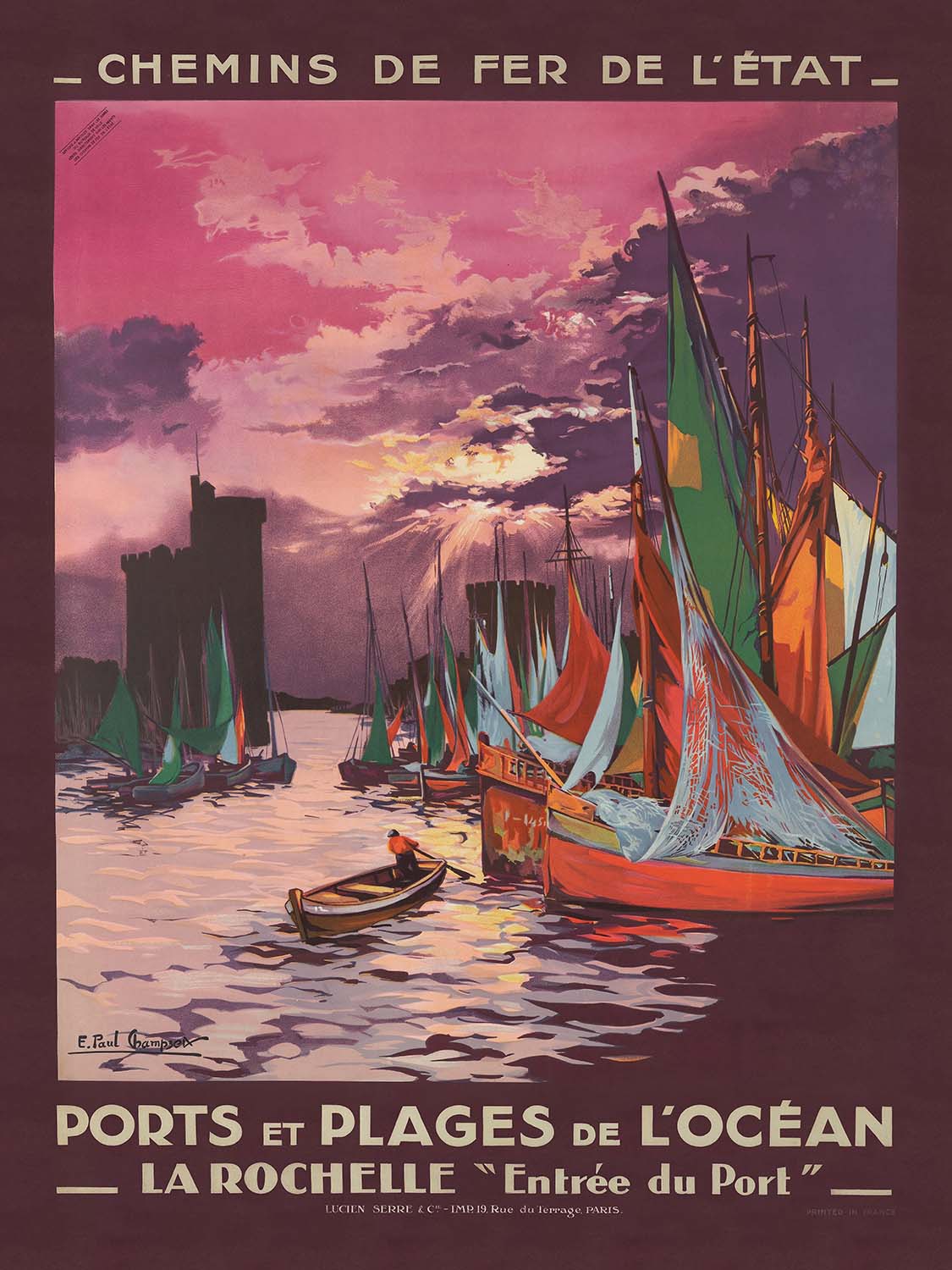 Ports et Plages de l’Océan. La Rochelle Entrée du Port by E. Paul Champseix (1928) captures the romance of arrival at the Atlantic gateway of La Rochelle at the height of France’s interwar travel boom. Designed in the sleek, modern idiom of Art Deco, the poster draws you into the harbor mouth at sunset, when sails cut sharp silhouettes and the water glows with reflected light. Created to entice holidaymakers to the Charente-Maritime coast, it evokes the promise of easy rail travel, sea air, and evenings along sun-warmed quays.