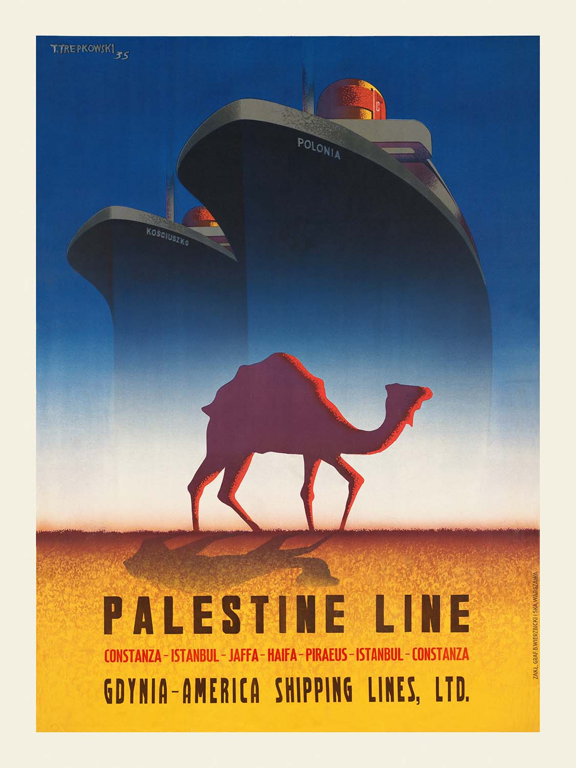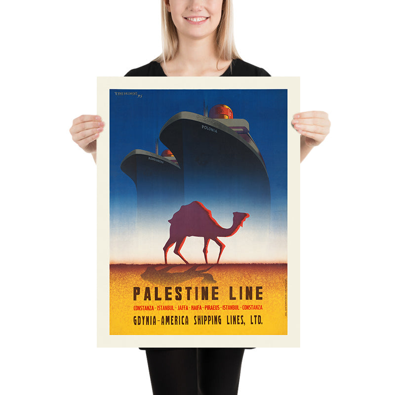 “Palestine Line” (1935) by T. Trepkowski is a quintessential Art Deco travel poster from the interwar era, celebrating maritime passage to the eastern Mediterranean at a time when ocean liners, streamlined design, and the romance of distant horizons stirred the imagination. Created during the British Mandate period, the work evokes the allure of journeys toward Palestine and the Levant—routes that linked European ports to sunlit harbors on the Mediterranean’s eastern shore. Its imagery—sleek ships set against a horizon that shifts from deep blue to warm, sandy tones—captures the era’s fascination with modern travel while nodding to the timeless desert landscape.