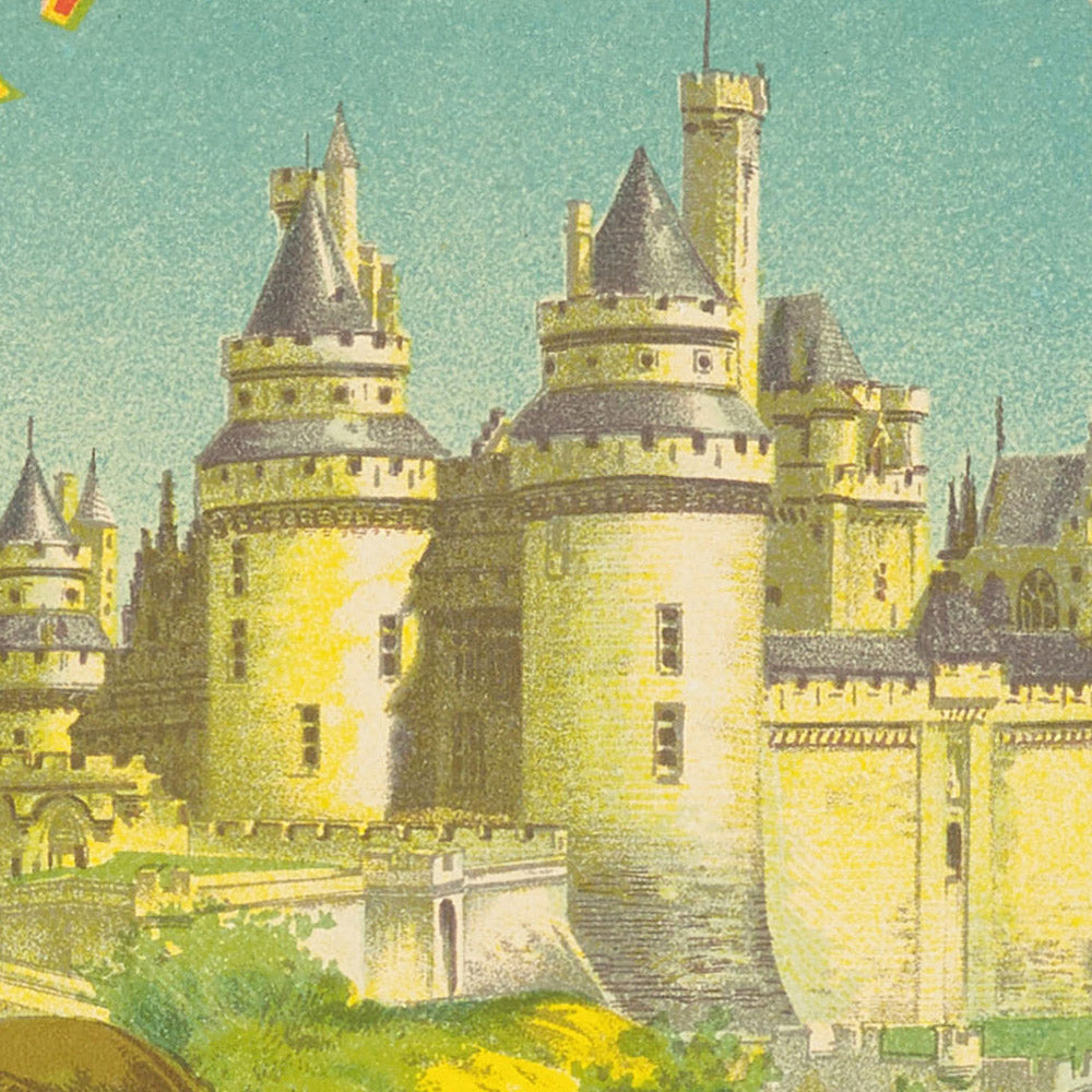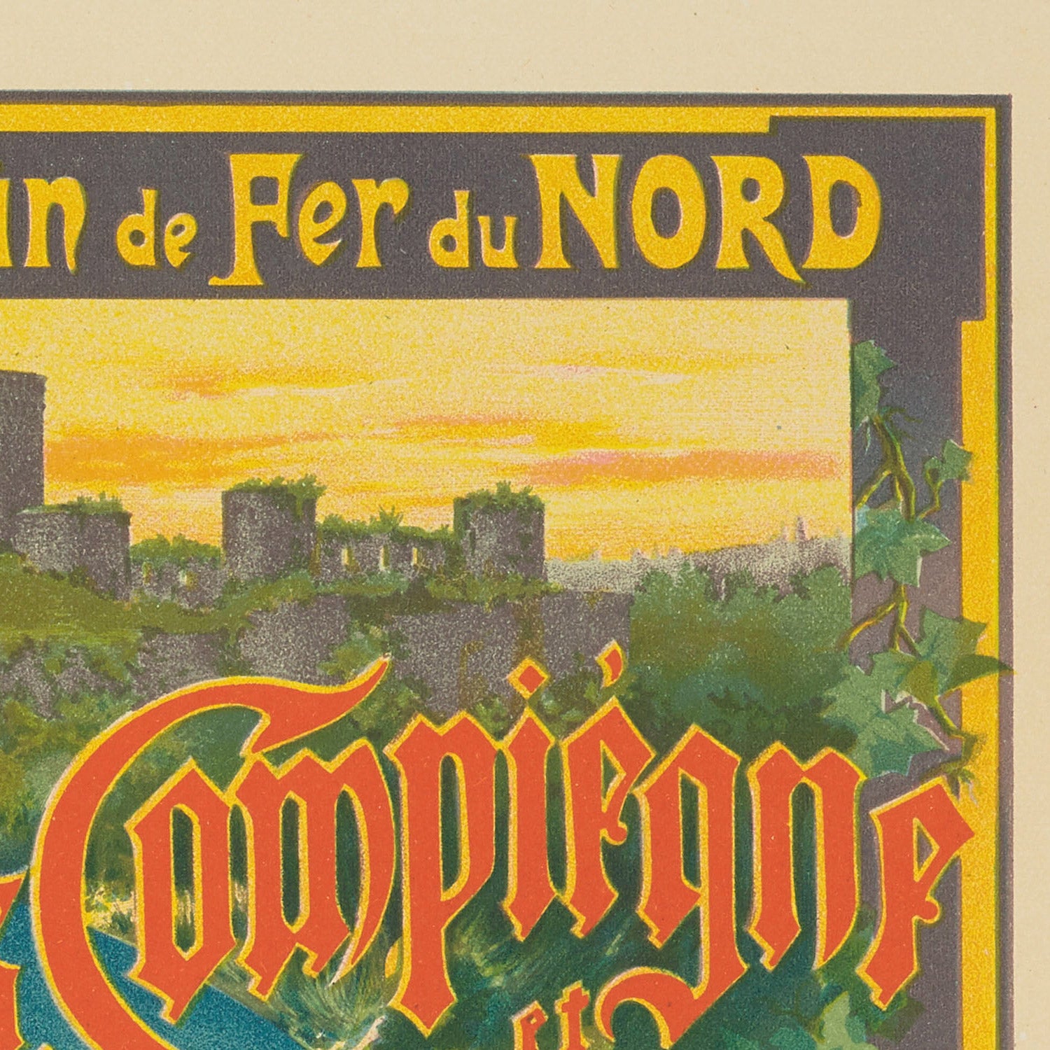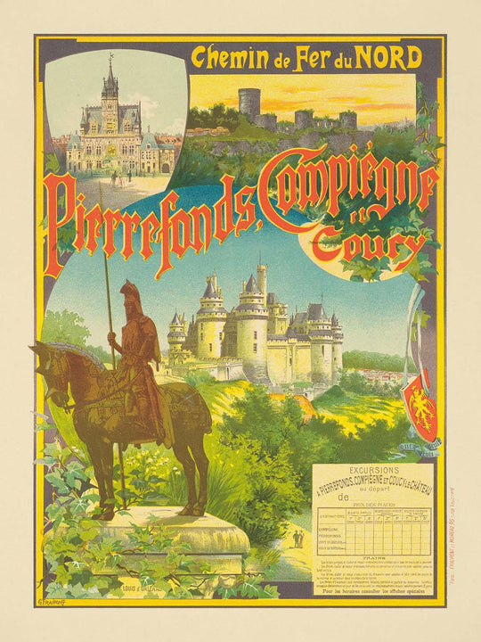 The subject of this poster resonates deeply with lovers of French history. Pierrefonds, extensively restored in the 19th century, embodies the Romantic revival of medieval architecture; Compiègne is famed for its imperial townscape and ancient forest; and Coucy—long a celebrated medieval stronghold—was a touchstone for travelers drawn to heroic ruins and grand châteaux. In the 1890s, railways transformed these sites into accessible cultural destinations, and posters like Fraipont’s captured the excitement of weekend excursions and the pride of a nation in its architectural treasures.
