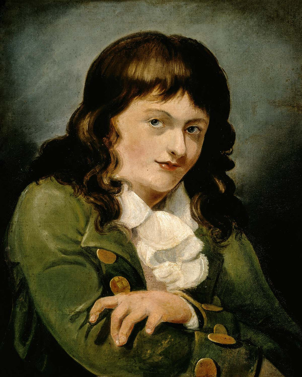 The palette and handling are especially compelling. A deep green coat anchors the composition, while warm notes of yellow and brown animate the complexion and clothing. The background—muted blues and grays—recedes softly, pushing the figure forward with atmospheric grace. Brushwork is confident yet unshowy: you can see more expressive strokes in the hair, while the face remains delicately modeled with soft, rounded forms. It’s a portrait that glows without gloss, making it ideal for spaces that embrace both Georgian restraint and Romantic warmth—think study, library, or an understated living room where nuanced color rewards close looking.