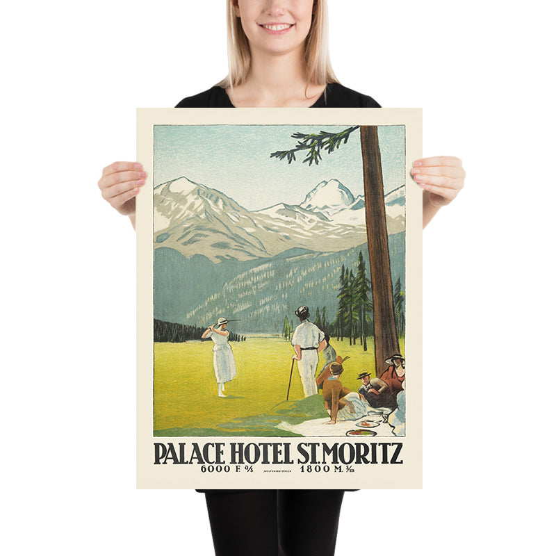 Palace Hotel. St. Moritz by Emil Cardinaux (1921) invites you into the rarefied calm of Switzerland’s Engadin valley at the dawn of modern leisure travel. A leading light of early Swiss poster art, Cardinaux distills the glamour of St. Moritz into a tranquil tableau: elegantly dressed visitors in bright whites enjoy the alpine air while, beyond them, blue lake waters, deep-green pines, and pale mountain peaks recede into the distance. Created in the post–World War I boom for grand hotels and European resort culture, the work captures the effortless sophistication that made St. Moritz an international byword for style.