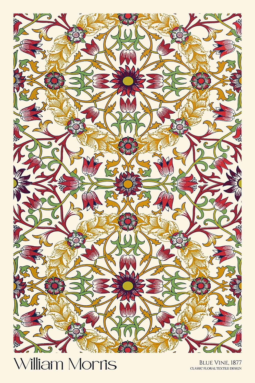 Blue Vine by William Morris (1877) is a quintessential Arts & Crafts pattern, designed at the height of Morris’s career when he sought to bring handcraft, nature, and beauty back into the home. Originally conceived as a repeating surface design—most likely for wallpaper, though it may also have been produced for textiles such as curtains or carpets—Blue Vine celebrates sinuous botanicals and balanced ornament, creating a timeless field of interlaced stems and stylized blossoms that feels both calm and richly alive.