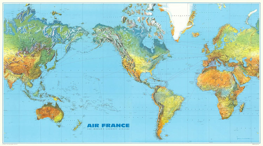 Große Weltkarte der Air France-Routen, 1961: Hell & Modern, Klimazonen, Topographie