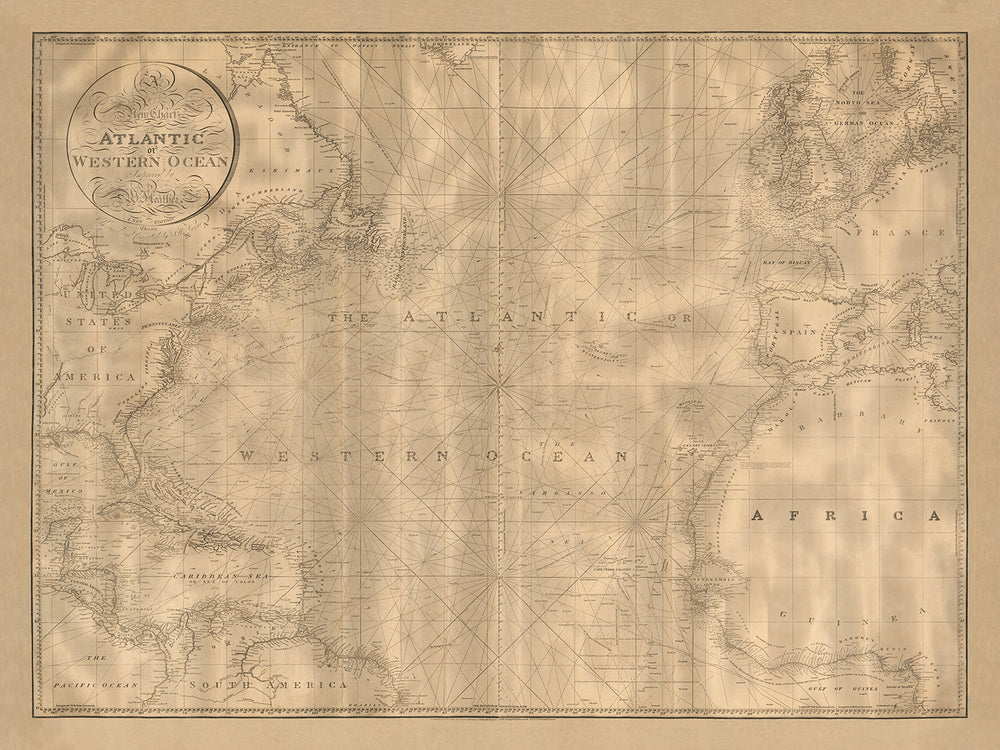 Das Design und der Stil der Karte sind beispielhaft für die frühe Kartografie des 19. Jahrhunderts, mit präzisen Tiefenmessungen (Wassertiefen in Faden) und Navigationshilfen wie Kompassrosen und Wasserkanälen. Die detaillierten Küstenlinien der Amerikas, Europas und Afrikas sind mit bemerkenswerter Genauigkeit dargestellt und zeigen das Können und die Liebe zum Detail des Kartografen. Der Zustand der Karte, trotz sichtbarer Gebrauchsspuren, spricht für ihre Authentizität und die praktische Rolle, die sie in der maritimen Navigation spielte.