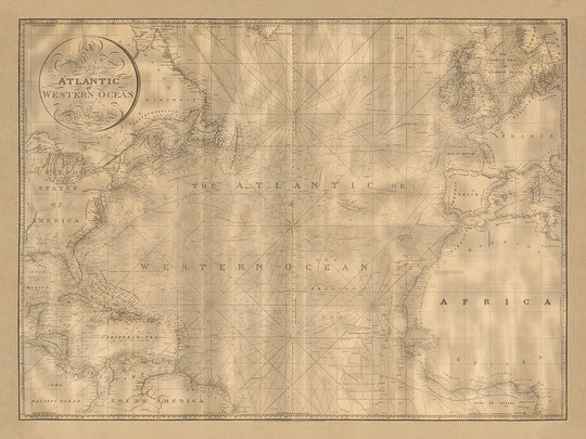 Der Schwerpunkt der Karte liegt auf dem Atlantischen Ozean und beschreibt die weite Ausdehnung von den Vereinigten Staaten und der Karibik bis zu den Küsten Europas und Afrikas. Sie verfolgt sorgfältig den Golfstrom, eine kritische Strömung für die Navigation, und hebt die vorherrschenden Strömungen hervor, die für transatlantische Reisen unerlässlich waren. Die Einbeziehung dieser ozeanografischen Merkmale unterstreicht nicht nur den praktischen Gebrauch der Karte für Seeleute, sondern spiegelt auch das wissenschaftliche Wissen der Zeit wider, was sie zu einem bedeutenden Bildungsinstrument macht.