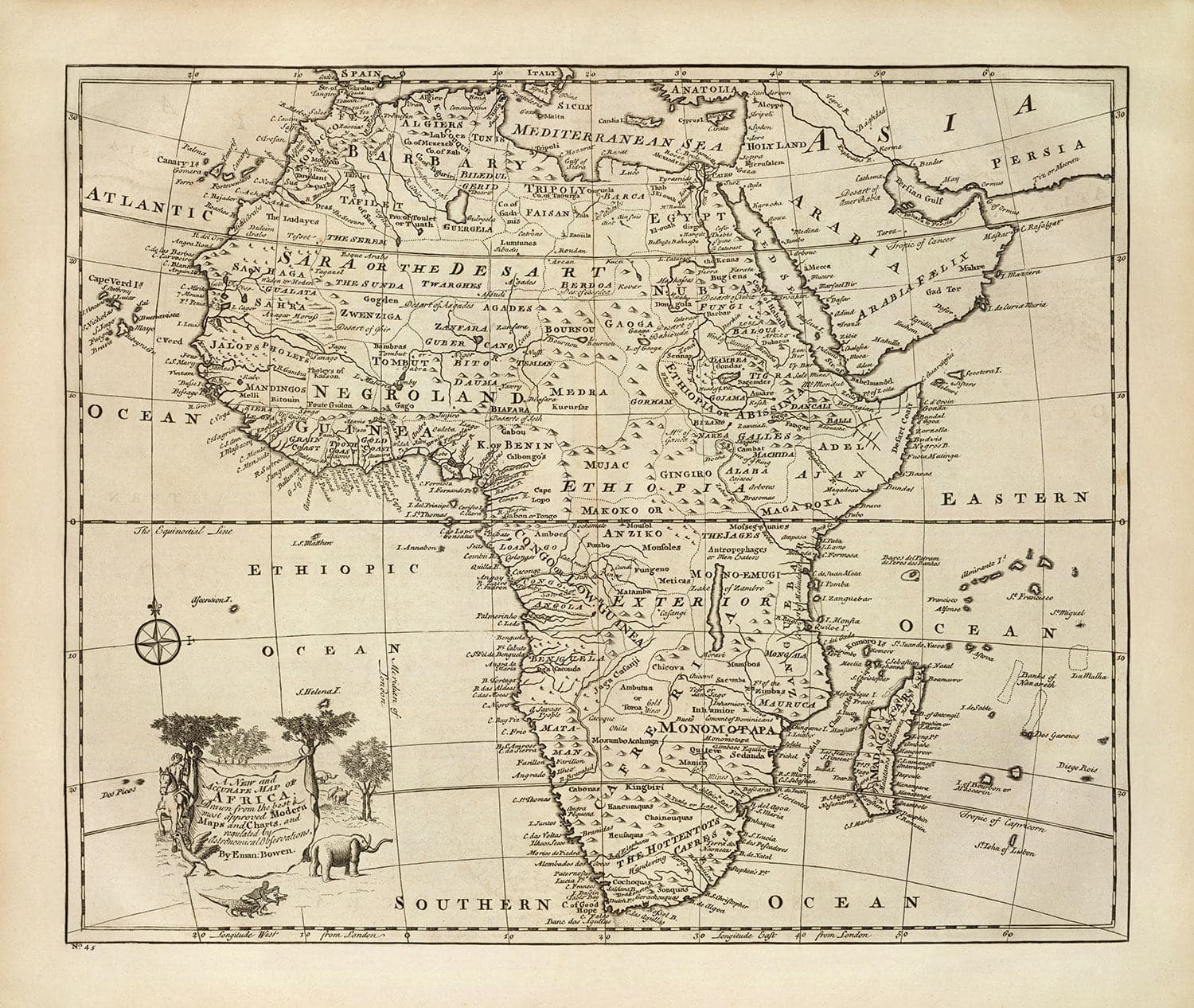 Ich habe auch die gleiche Negroland-Karte, aber mit fast 300 Jahre alter Handkolorierung, die möglicherweise besser zu Ihrem ästhetischen Geschmack/Dekor passt.