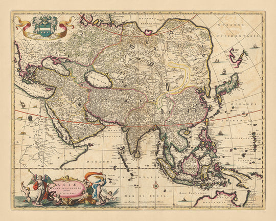 Die „Asiae nova delineatio“ ist mehr als nur eine Karte; Es ist ein Fenster in eine vergangene Ära. Es zeigt die politischen Spaltungen der Zeit und gibt den Zuschauern einen Einblick in das komplexe Netz von Territorien, das einst den asiatischen Kontinent umspannte. Die Karte erstreckt sich nach Westen bis zur Türkei und nach Ägypten und erfasst die ausgedehnte Reichweite des asiatischen Einflusses, und nach Südosten bis zum oberen Rand Australiens, was auf die aufkeimende Erforschung der südlichen Hemisphäre hinweist. Wasserstraßen, Kanäle, Seen und Berge werden sorgfältig dargestellt und spiegeln die natürliche Topographie der Region wider.