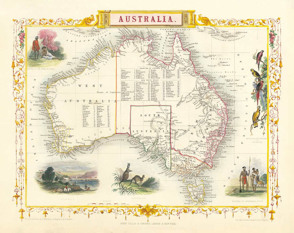 Über die Karte verteilt sind wunderschöne, detaillierte Gravuren bemerkenswerter Wahrzeichen und Ausblicke, wie ein paar Kängurus, einige "Ureinwohner Australiens", eine malerische Aussicht auf Sydney und eine wirklich schöne Sammlung von Papageien.