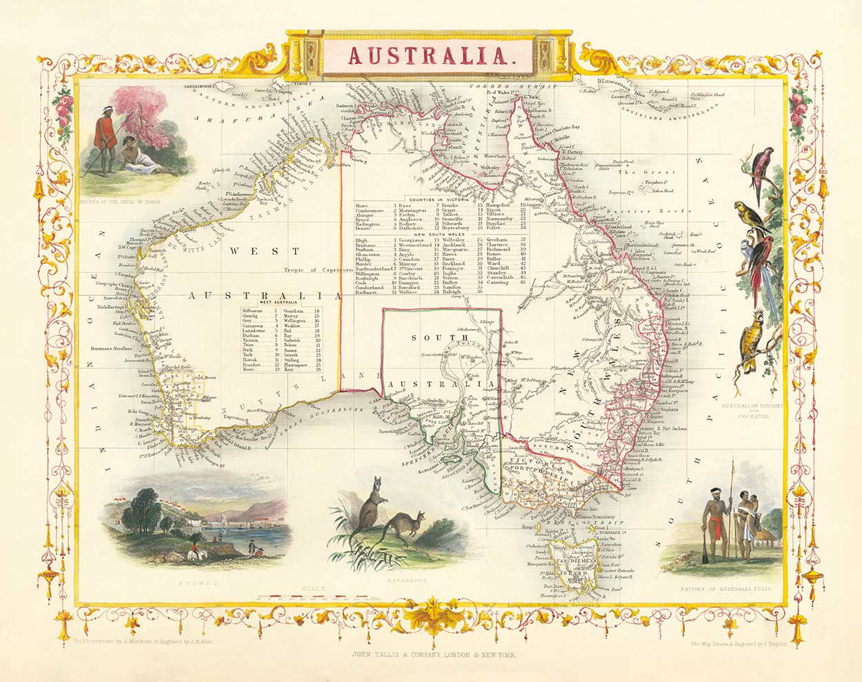 Graviert von John Rapkin und veröffentlicht von J. Tallis & Co im Jahr 1851, ist dies eine der schönsten und detailliertesten historischen Karten Australiens, zu einer Zeit, als... nun, schauen Sie sich die Karte an - fast kein Land außer den Küsten wurde kolonisiert. Australien war erst etwa 60 Jahre zuvor gegründet worden - und falls Sie sich fragen, 1851 war das Jahr, in dem der Goldrausch offiziell begann!