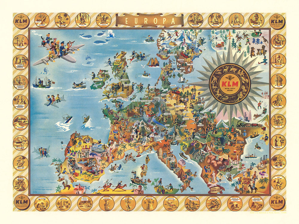 KLM, bekannt für sein ausgedehntes Netzwerk und seine historische Bedeutung in der Luftfahrtbranche, hat diese Karte in Auftrag gegeben, um die Faszination europäischer Reiseziele hervorzuheben. Die Karte dient sowohl als Werbemittel als auch als kulturelles Artefakt und spiegelt das Engagement der Fluggesellschaft wider, Reisende mit den vielfältigen Kulturen Europas in Kontakt zu bringen. Der dekorative Rand, geschmückt mit Bildern von Städten aus aller Welt, unterstreicht die globale Reichweite und den kosmopolitischen Geist von KLM noch weiter.
