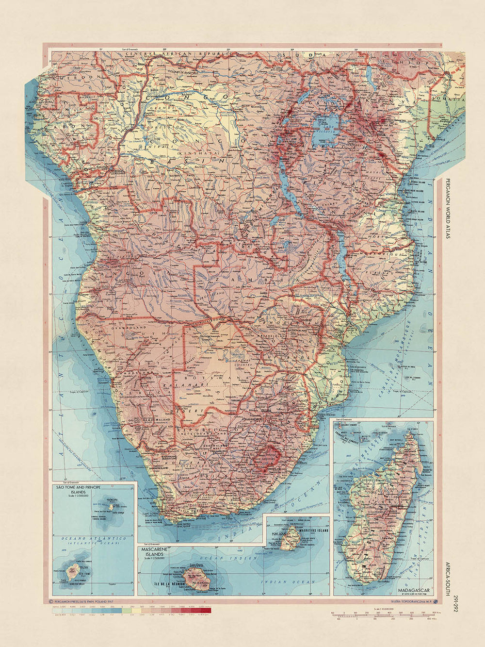 Abschließend ist der künstlerische Stil des Kartenerstellers erwähnenswert. Der topografische Dienst der polnischen Armee war für seine Präzision und Genauigkeit bekannt, und diese Karte bildet da keine Ausnahme. Die sorgfältige Abgrenzung politischer Grenzen, die detaillierte Darstellung physischer Merkmale und die durchdachte Einbeziehung von Einschüben tragen alle zu einer Karte bei, die ebenso ästhetisch ansprechend wie informativ ist. Die Projektion der Karte, ein entscheidender Aspekt jeder kartografischen Arbeit, wird mit Präzision ausgeführt, um sicherzustellen, dass die Karte so genau wie möglich ist. Dieses Engagement für Genauigkeit und Ästhetik macht die Karte „Afrika – Süden“ zu einer wertvollen Ergänzung jeder Sammlung.
