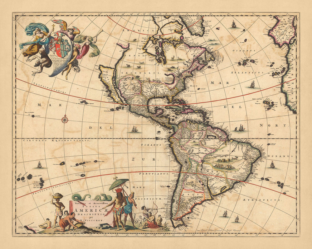 Alte Karte von Amerika von Visscher, 1690: Mittelamerika, Karibik, Polynesien, Atlantische Inseln, Amazonas-Regenwald