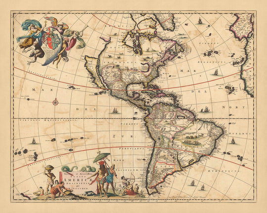 Entdecken Sie das pulsierende Mittelamerika, den tropischen Charme der Karibik, die Weiten des Amazonas-Regenwaldes und die Mystik Polynesiens und der Atlantikinseln. Die einzigartige Handkolorierung in Umrissen und eingravierten Details erweckt diese Regionen zum Leben und zeigt die Städte, Ortschaften, Wasserstraßen, Kanäle, Wahrzeichen und Indianersiedlungen, aus denen die westliche Hemisphäre am Ende des 17. Jahrhunderts bestand.