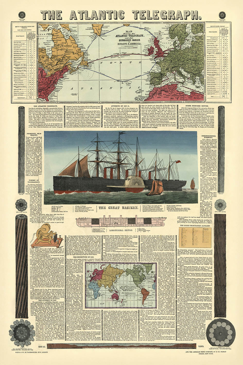 Diese Karte zu besitzen, ist wie ein Stück Geschichte in den Händen zu halten. Sie fängt einen Moment ein, als die Welt kleiner und verbundener wurde, dank des Pioniergeistes derjenigen, die es wagten, von sofortiger Kommunikation über weite Ozeane zu träumen. Diese Karte ist perfekt für Geschichtsbegeisterte, Sammler und jeden, der die komplexe Mischung aus Kunst, Wissenschaft und Geschichte schätzt. Präsentieren Sie sie stolz als Erinnerung an menschliche Genialität und den unermüdlichen Streben nach Fortschritt.