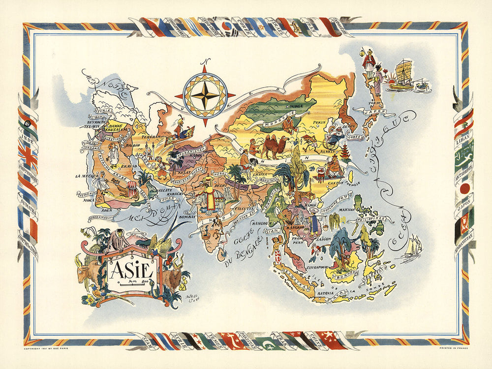 Jacques Liozu, berühmt für seine thematischen und bildlichen Karten, verleiht „Asie“ eine einzigartige Mischung aus Kunstfertigkeit und Präzision. Seine Fachkenntnis zeigt sich in der dekorativen Titelkartusche und den Rändern der Karte, die eine Reihe von Flaggen und Symbolen aufweisen, die einen Hauch von Eleganz und historischen Kontext verleihen. Liozus Entscheidung, Russland von dieser Karte auszuschließen, unterstreicht den Fokus auf die Kernregionen Asiens und ermöglicht eine konzentriertere Erkundung der komplexen Dynamik des Kontinents.