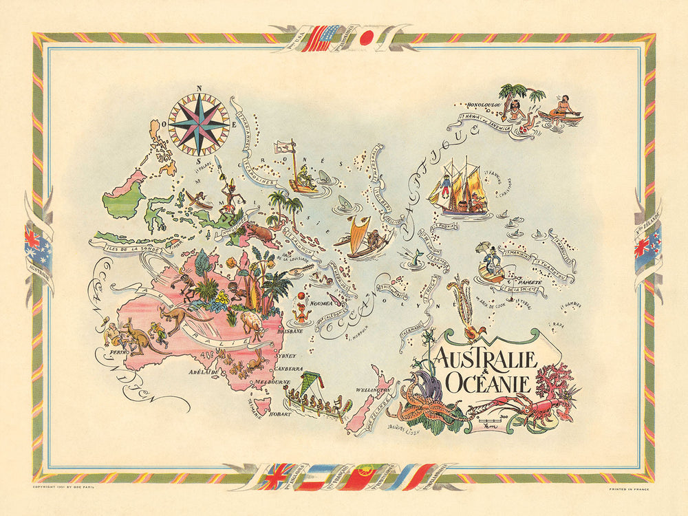 Alter bildlicher Karte von Australien & Ozeanien von Liozu, 1951: Neuseeland, Fidschi, Papua-Neuguinea, Hawaii, Pazifische Inseln