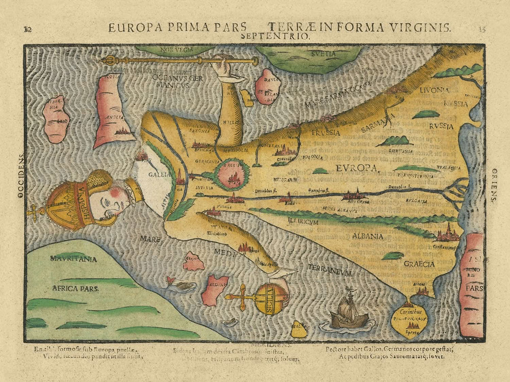 "Europa Prima Pars Terrae In Forma Virginis" ist ein fesselndes Meisterwerk des renommierten protestantischen Theologen Heinrich Bunting, das 1616 geschaffen wurde. Diese außergewöhnliche Karte präsentiert Europa als königliche Königin, eine einzigartige anthropomorphe Darstellung, die Historiker und Sammler gleichermaßen fasziniert. Buntings Werk spiegelt das reiche Geflecht der europäischen Politik und Religion des 16. Jahrhunderts wider und fängt das Wesen des Kontinents auf eine sowohl künstlerische als auch symbolische Weise ein. Diese Karte ist nicht nur eine geografische Darstellung, sondern eine Erzählung von Macht, Glauben und Identität, die Europa in einer Form zeigt, die seiner historischen und kulturellen Bedeutung gerecht wird.