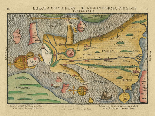 Diese exquisite Karte ist mehr als ein Sammlerstück; sie ist ein Stück Geschichte, das die Geschichte eines Kontinents erzählt. Ihr anthropomorphes Design, reiche Symbolik und historische Bedeutung machen sie zu einem geschätzten Artefakt für jeden Enthusiasten der Kartografie oder der europäischen Geschichte. Der Besitz dieser Karte ist gleichbedeutend mit dem Halten eines Stücks der Vergangenheit, einer Erinnerung an das bleibende Erbe der kulturellen und politischen Evolution Europas.