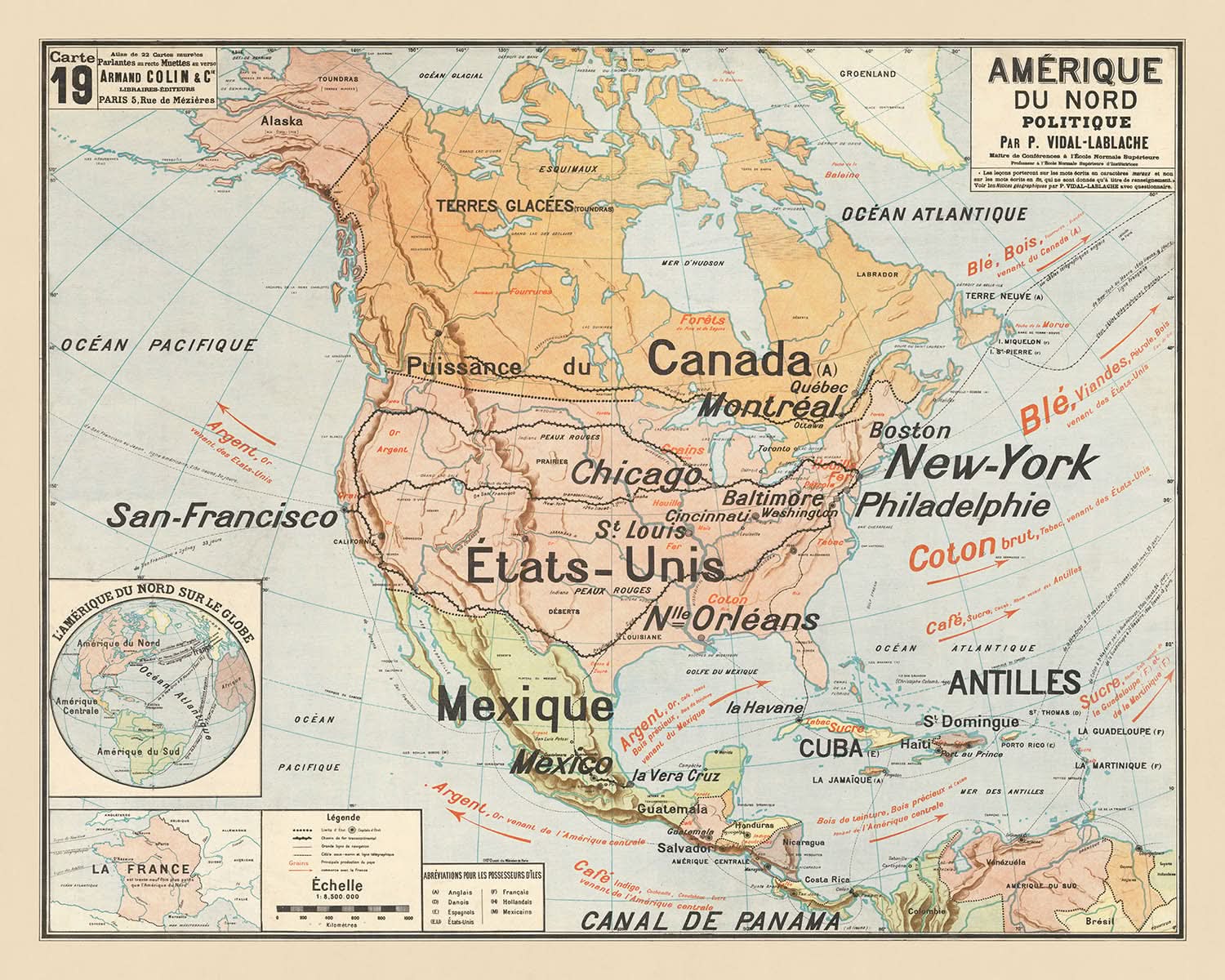 Alter Wandkarte von Nordamerika von Vidal Lablache, 1921: Bildungsdesign, Handelsrouten