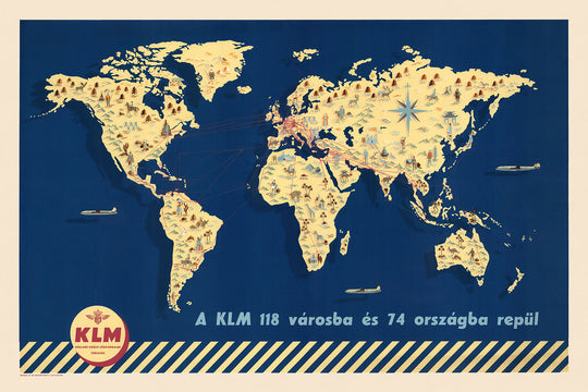 Alte Weltkarte der Flugrouten von KLM, 1955: 118 Routen, 74 Länder, bildliche Sehenswürdigkeiten